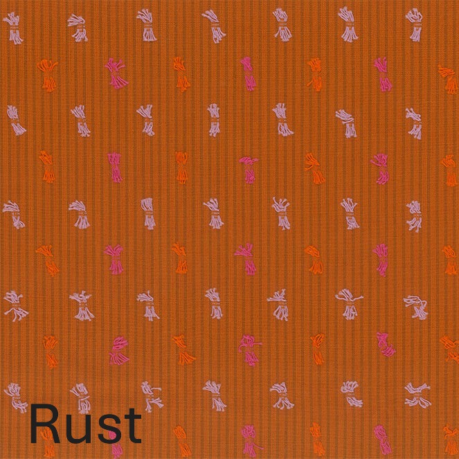 En lækker vævet bomuld i gyldne rust farver. Prikkerne har indvævet tråd ender på den ene side, der laver prikker på den anden side.